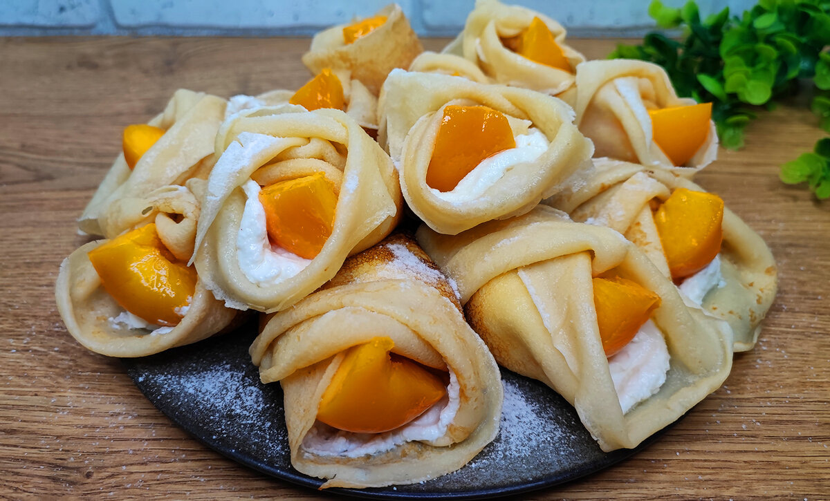 На центр каждого блина располагается ложка творожной массы и кусочек персика, после чего блинчик сворачивается в конвертик. Перед подачей посыпьте сахарной пудрой — ваш стол наполнился радостью, словно солнечное утро!