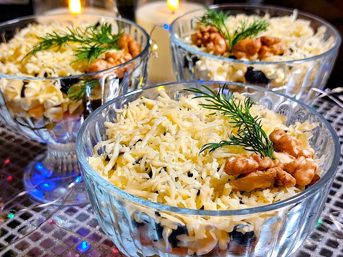 Убрав салат в холодильник на несколько часов или на ночь, вы получите изысканное блюдо, которое порадует как гостей, так и близких. Он станет настоящим украшением любого застолья, гармонично вписавшись в новогоднее меню.