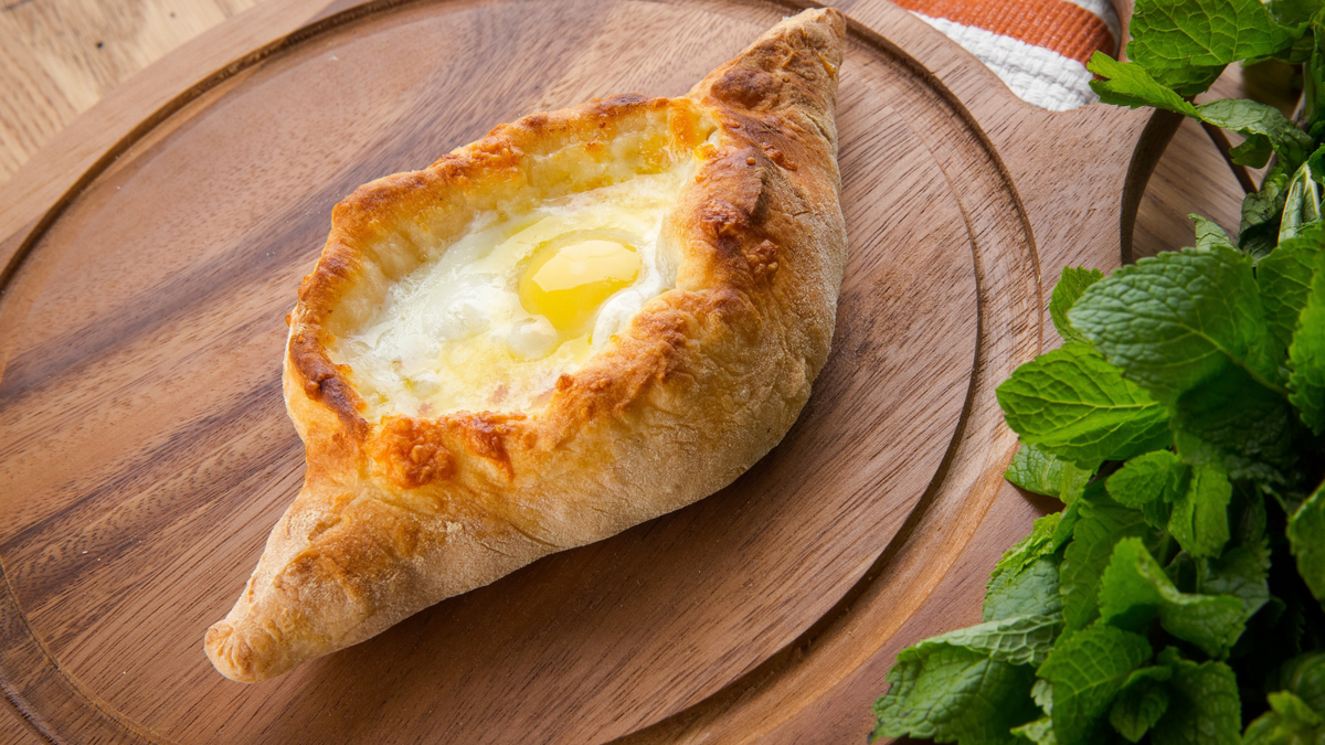 - Хачапури по-аджарски: Эта лодочка с сыром и яйцом — символ грузинской кухни. Её готовят с дрожжевым тестом и начинкой из двух видов сыра.