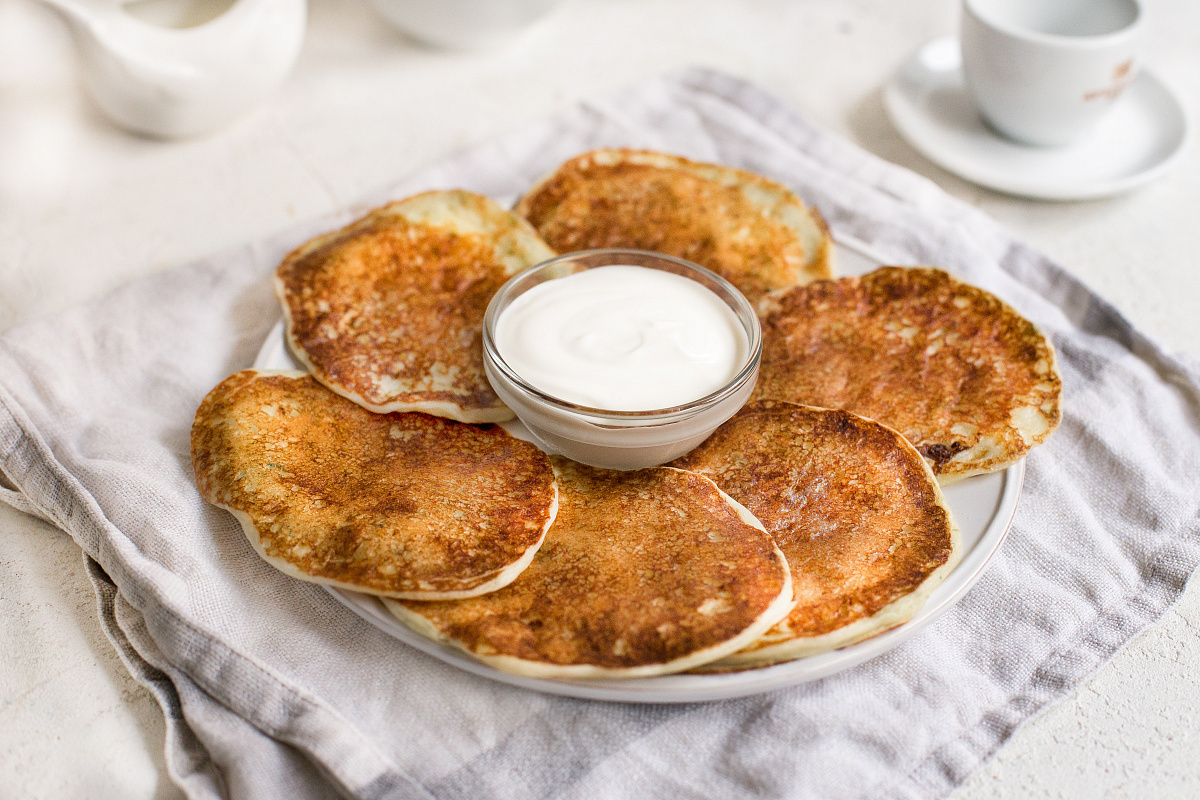 Шаг 2: Разогрейте сковороду с 1 столовой ложкой растительного масла. Порциями выкладывайте тесто на сковороду с помощью столовой ложки, формируя аккуратные оладьи. Жарьте на среднем огне, обращая внимание на пузырьки — как только они начнут лопаться, переверните оладьи. Постарайтесь поддерживать комфортную температуру на сковороде: тесто лучше выкладывать на раскаленную поверхность, а готовить на среднем огне. Время жарки может варьироваться в зависимости от мощности вашей плиты и типа сковороды. Подавайте оладьи горячими, с порцией сметаны.