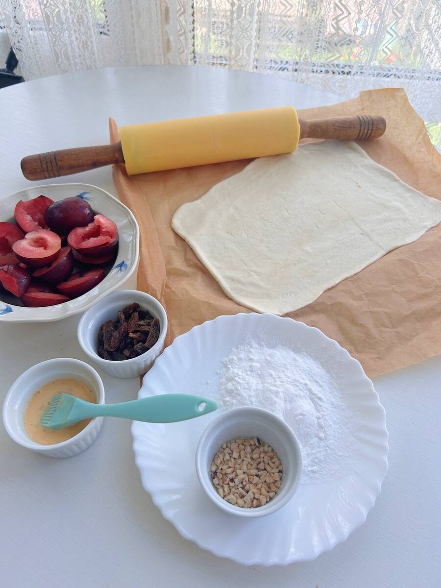 В начале процесса необходимо раскатать слоеное тесто. Сделайте аккуратные надрезы, чтобы рулет стал более привлекательным при подаче. Сливы обваляйте в сахарной пудре и выложите на тесто, разместив их равномерно. Затем добавьте изюм, заверните рулет и хорошенько зафиксируйте края.