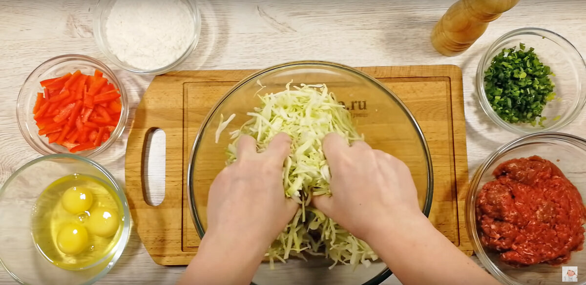 В первую очередь, необходимо взять 400 граммов молодой капусты. Ее стоит хорошо нарезать, посолить и слегка помять, чтобы она стала мягче и обогатила лепешки своим соком.
