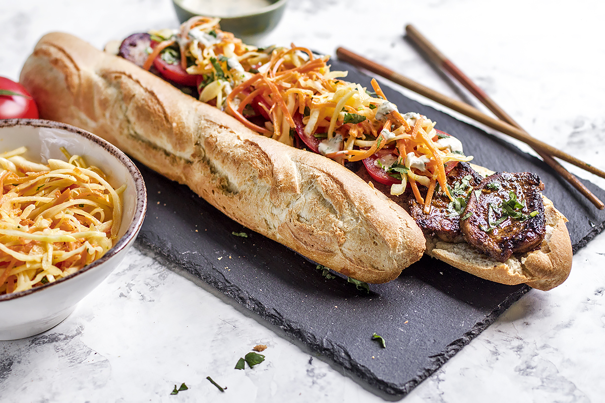 Погрузитесь в мир вьетнамской кухни с невероятным сэндвичем банми, который станет настоящим кулнарным открытием! Это блюдо идеально сочетает в себе ароматные свиные медальоны, свежие овощи и уникальные соусы.