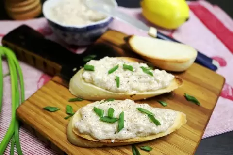 Подайте получившуюся массу на подсушенных ломтиках багета или хлеба. Эта простая и вкусная закуска украсит любой стол и станет настоящим хитом ваших встреч!