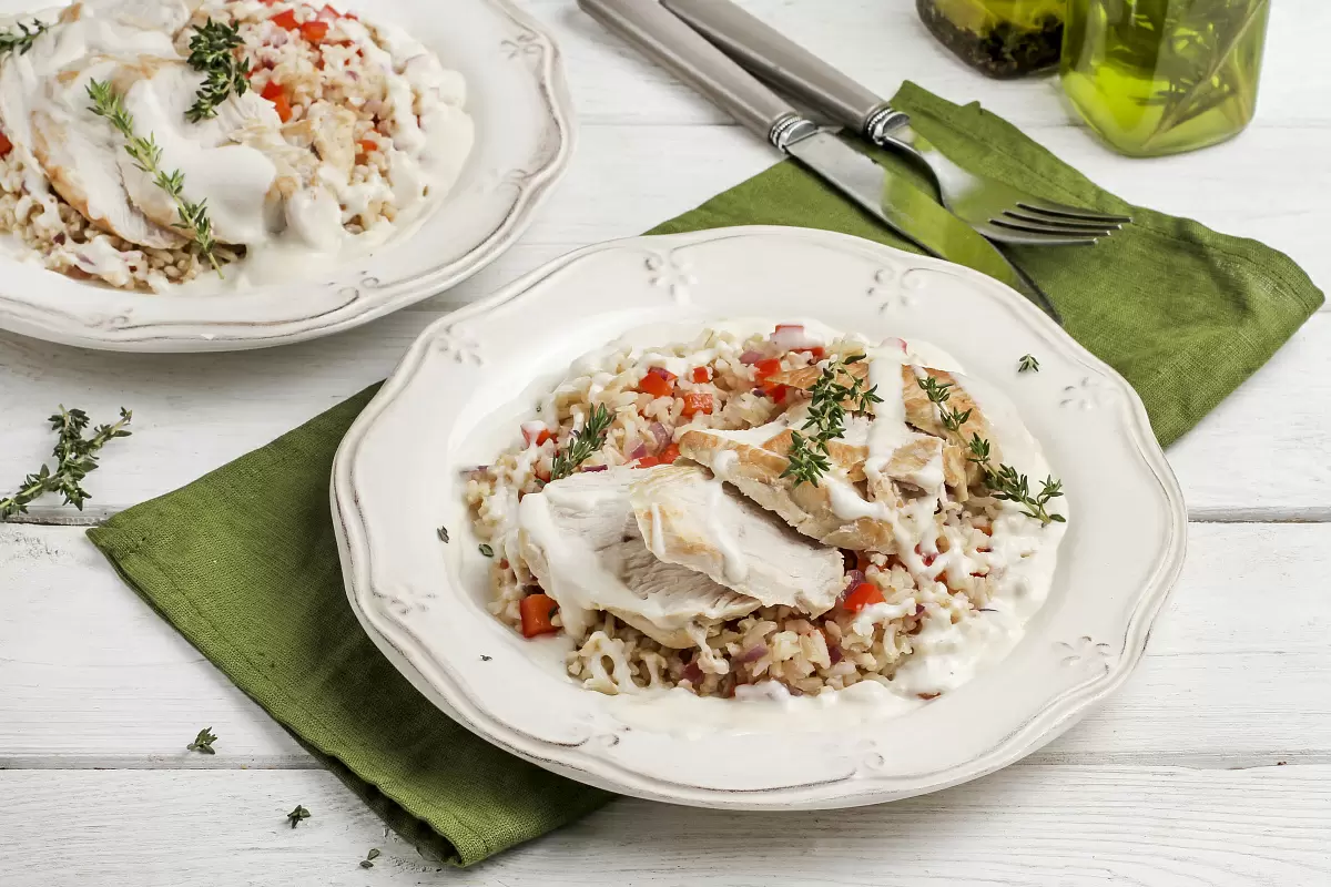Шаг 3: Избавьтесь от семян в перце и нарежьте его вместе с луком мелкими кубиками. Обжарьте смесь на растительном масле до мягкости, затем добавьте в кастрюлю с рисом и хорошо перемешайте. Подавайте блюдо вместе с индейкой и соусом бешамель. Если нет желания запекать индейку, можно нарезать ее на ломтики толщиной около 1 см и обжаривать на сковороде до готовности, укрывая крышкой в последние минуты.