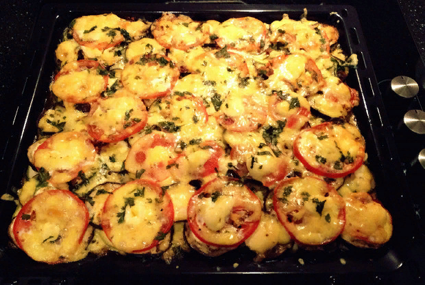 3. За картошкой равномерно распределите кабачки, так же приправив их капелькой майонеза. Продолжите с баклажанами, выкладывая их в третий слой.
