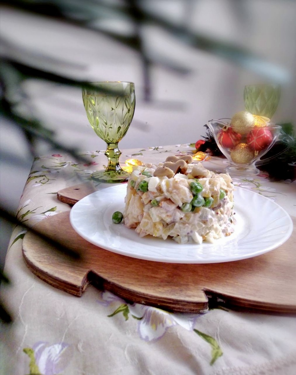 Под рукой — вареный картофель, яйца, соленые грибы, маринованные огурцы и зеленый горошек. Острый акцент задаётся заправкой на основе сметаны с зернистой горчицей; соль подбирается по вкусу. Небольшие кубики и аккуратная нарезка превращают набор в цельное блюдо.