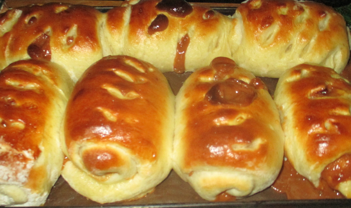 Раскатываем шарики в лепешки, кладем по ложке вареной сгущенки и собираем края, формируя булочки. Располагаем их на противне и смазываем взбитым яйцом.