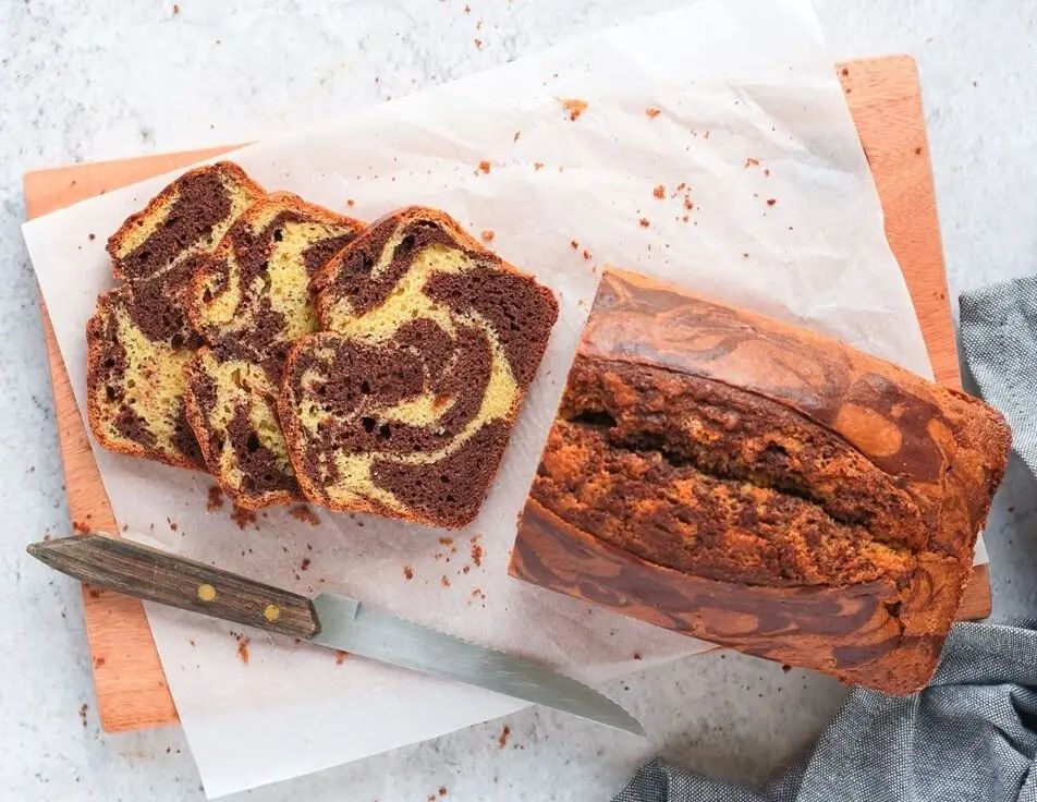 Подготовьте форму для выпечки, смазав ее маслом и посыпав мукой. Затем по очереди выливайте в форму белое и шоколадное тесто, используя ложку, пока обе смеси не закончатся. С помощью вилки создайте мраморный узор, проводя по тесту спиральными движениями.