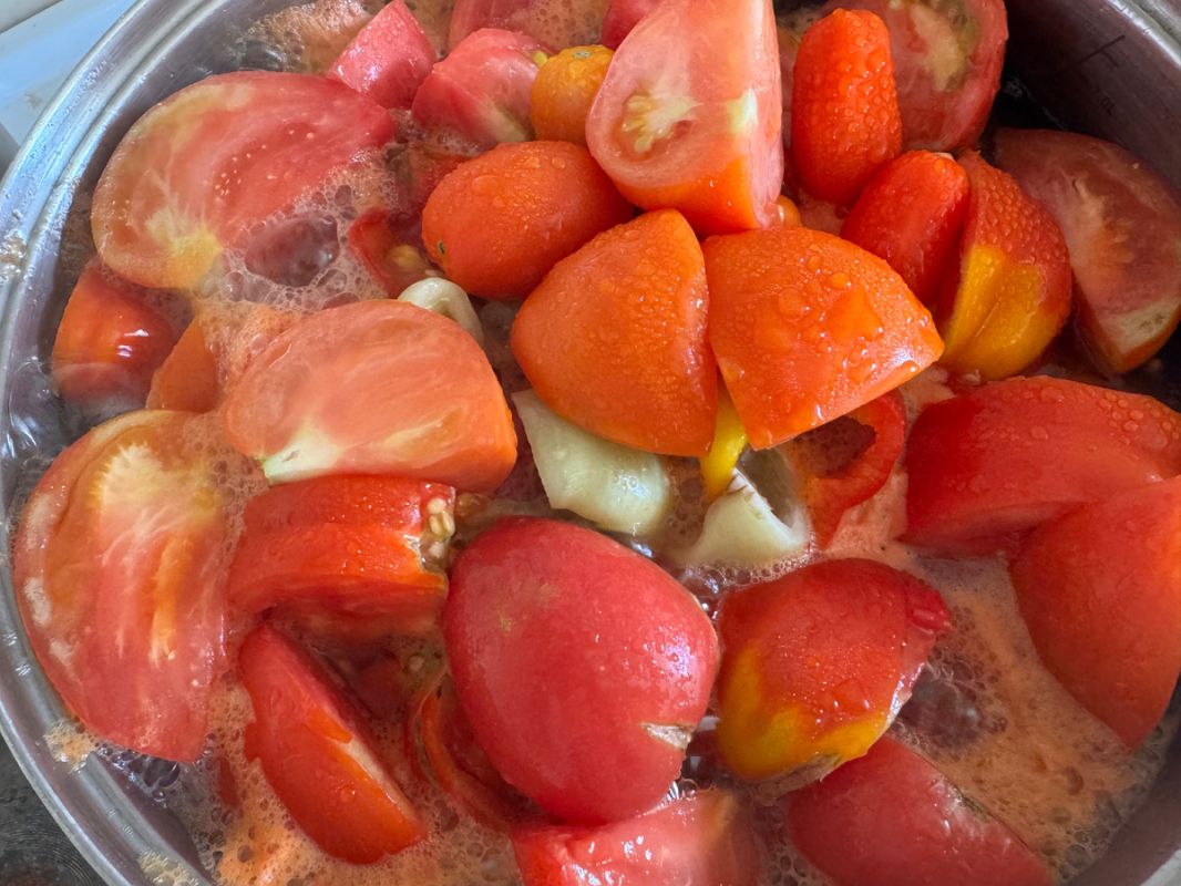 Томаты нарезают на крупные дольки. Они пятидесятилитровой кастрюле (размер 5-6 литров) заливается стакан воды, чтобы избежать подгорания.