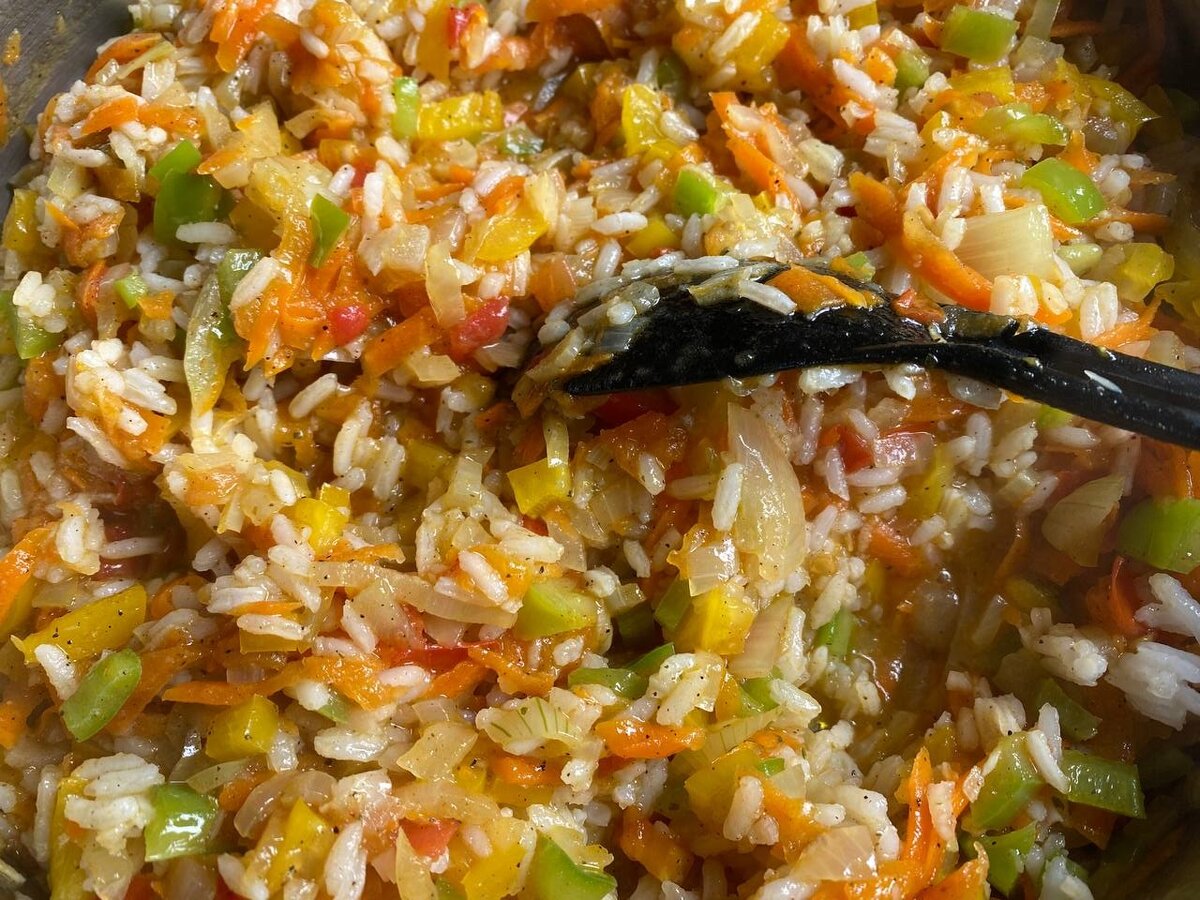 Сначала необходимо отварить рис до готовности. Пока он варится, подготовьте овощи: мелко нарежьте лук, натрите морковь, нарежьте болгарский перец и помидоры кубиками.