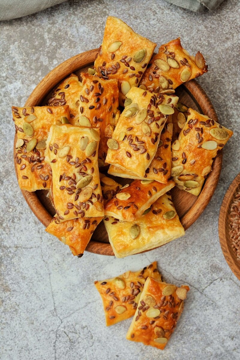 Эти крекеры не только прекрасная закуска, но и отличный способ подать полезные ингредиенты, такие как семена льна и тыквы, в непринужденной форме. Приятного аппетита!