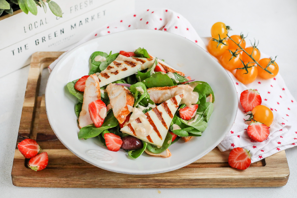Сыр халумис, родом с Кипра, идеально подходит для жарки. Он не плавится, а при приготовлении покрывается красивой золотистой корочкой, сохраняя свою нежность внутри. Сочетание сладкой клубники и солёного сыра создаёт удивительный контраст вкусов.