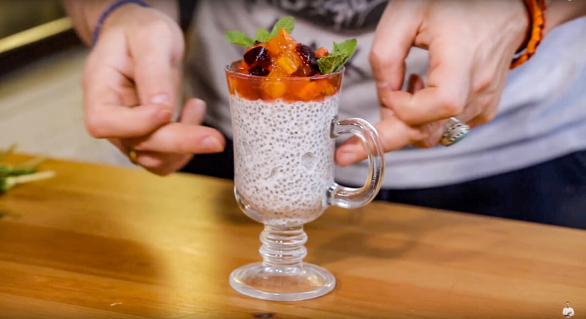 5. После этого готовый пудинг переложите в красивый бокал или чашку и украсьте фруктами, добавив сироп от них и несколько листочков мяты.