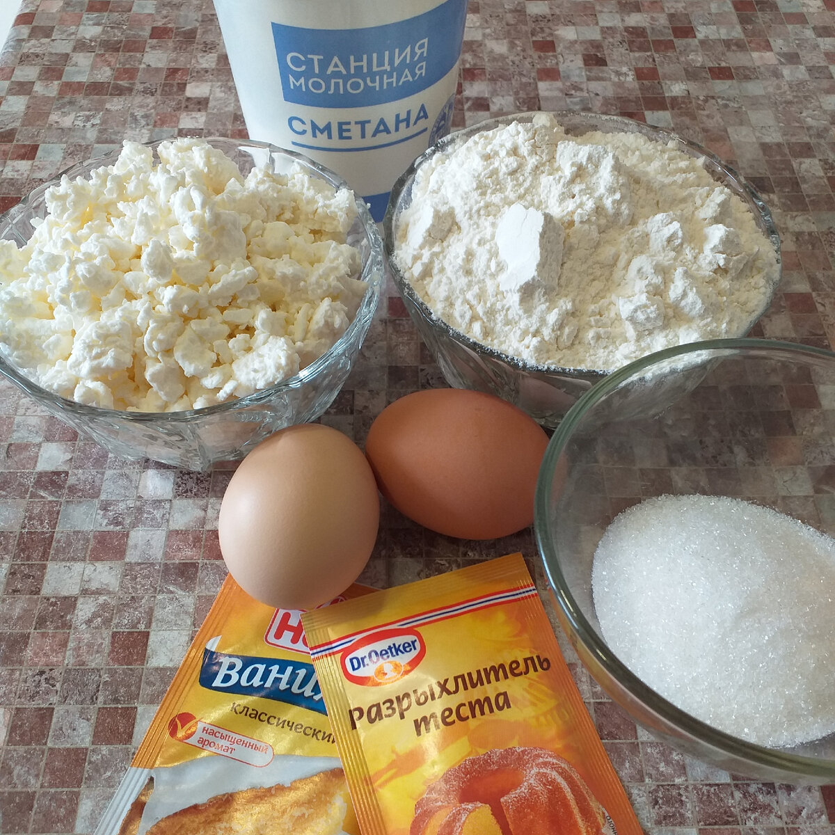 В глубокой миске сочетайте творог, сахар, соль и сметану, добавьте яйца. Взбейте смесь до однородного состояния. После этого просейте муку вместе с разрыхлителем прямо в творожную массу и тщательно перемешайте. В результате должно получиться мягкое, слегка липкое тесто.