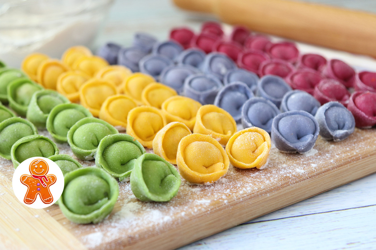 Тесто можно окрасить множеством овощных соков. В этот раз использовались морковь, краснокочанная капуста, свекла и шпинат. Кроме того, для цвета добавлены куркума и томатная паста.