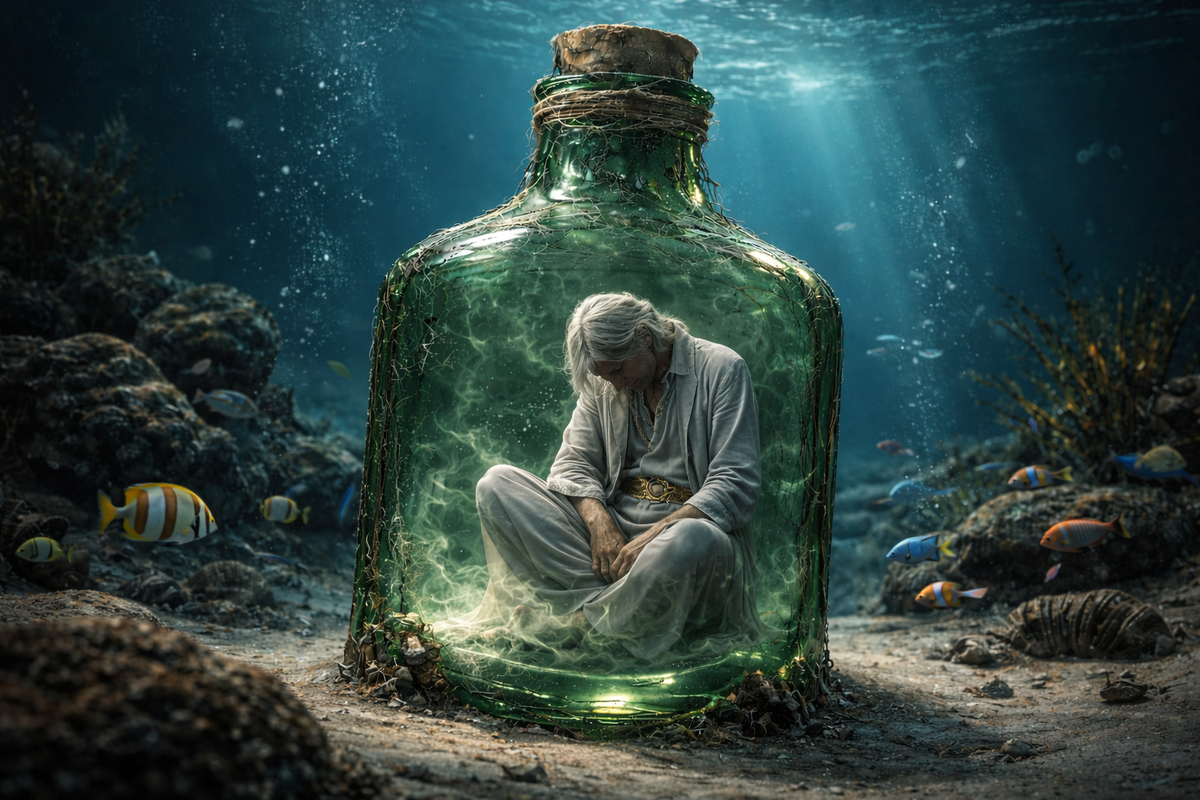 Как бы ни была велика сила джинна, за пределами бутылки она ограничивалась лишь желаниями хозяина, а внутри её влияние было ничтожным. Лишь спустя столетия его сосуда нашли искатели сокровищ. Подбрасывая к реальным сокровищам, он чертил схемы пирамид и путей к богатствам, ожидая своего первого хозяина. Но вот беда: старая лодка, нанятая гробокопателями, пошла ко дну, и его путь к свободе только начинался.