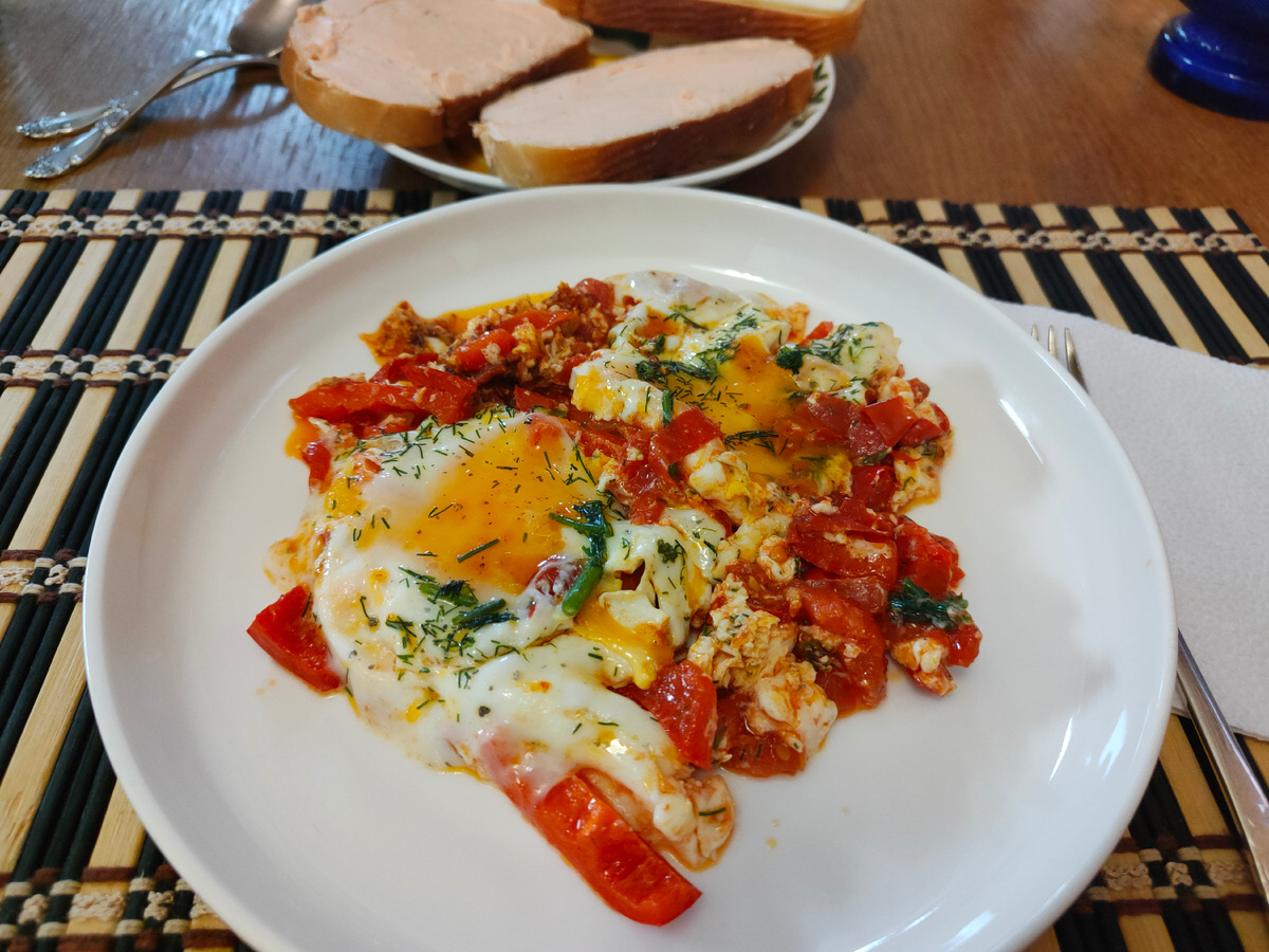 Завтрак: Яичница с овощами и бутерброды с кремом-фиш (по рецепту с слабосолёным лососем) с чашечкой кофе из френч-пресса. Обратите внимание, кофе появляется на столе только после основного блюда, чтобы не остыть.