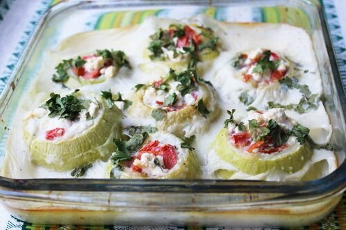 Начинка: Нарежьте помидоры кубиками, нашинкуйте зеленый лук и раскрошите брынзу. Добавьте выжатый чеснок, немного соли и перца, перемешайте все ингредиенты и начините полученной смесью патиссоны. Выложите их в форму для запекания.