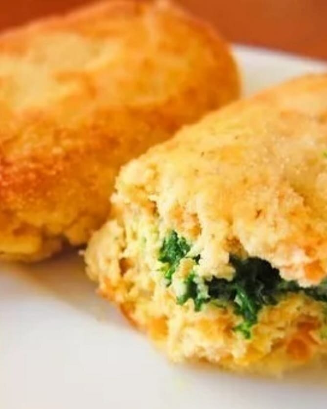 Как только смесь остынет до комнатной температуры, сформируйте из нее овальные котлеты, добавив внутрь немного обжаренного шпината. Обваляйте котлеты в панировочных сухарях и обжарьте на сковороде до появления золотистой корочки с обеих сторон.