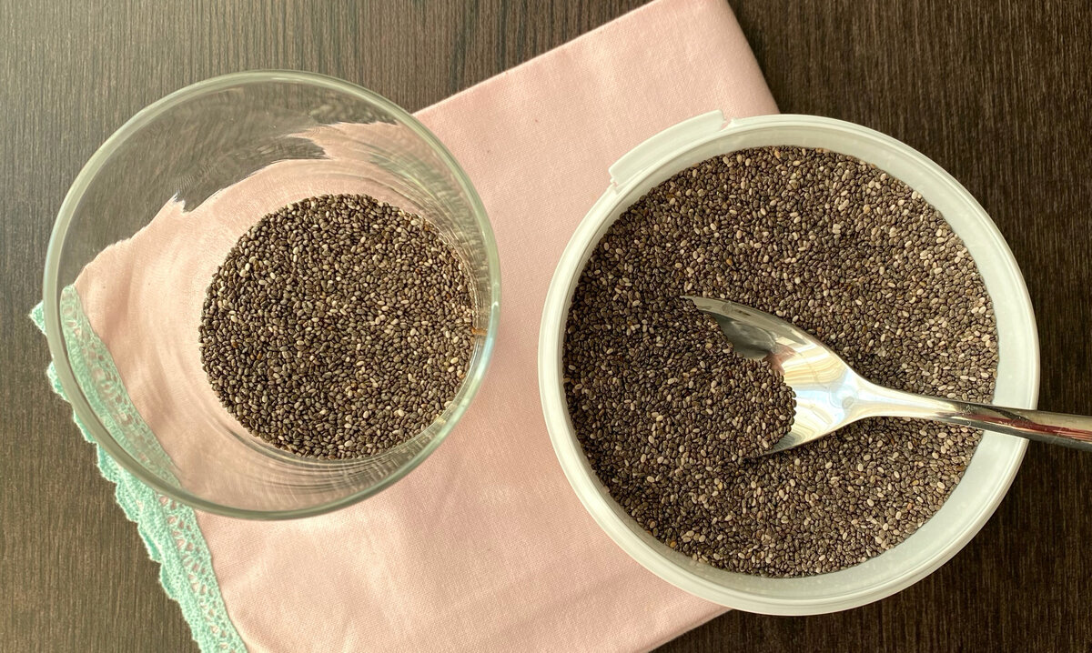 Начать стоит с семян чиа. Их нужно всыпать в стакан и залить холодной водой, тщательно перемешав. Не стоит пренебрегать этим этапом, иначе чиа склеятся в комки. Через 20 минут семена набухнут, и можно продолжить.