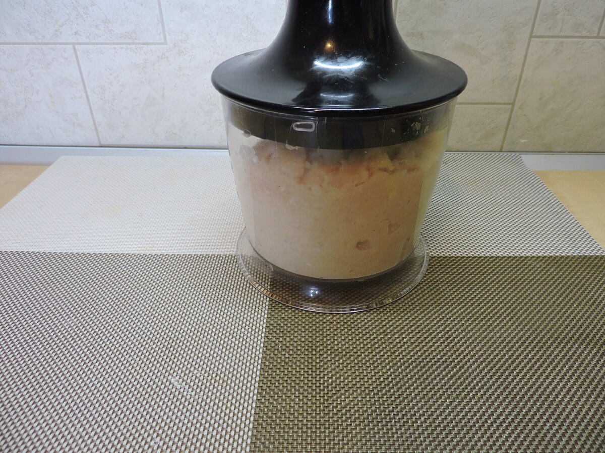 1. Вначале куриную грудку и лук следует измельчить с помощью блендера до получения однородной массы.