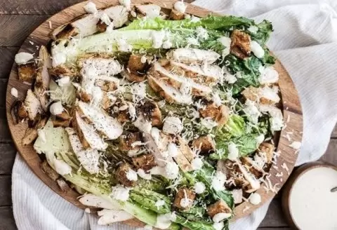 - Салат «Цезарь» с курицей: Этот классический салат станет отличным украшением любого стола. Главное — хранить все ингредиенты отдельно до самой подачи. Гренки, запеченная курица и соус можно подготовить за несколько дней до праздника.