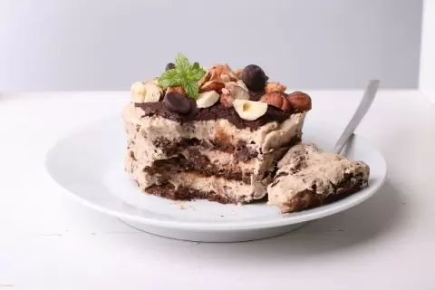Сначала чернослив необходимо залить кипятком, чтобы он стал мягким и легко измельчался.Отделите белки от желтков и смешайте половину чернослива с яичными желтками, используя погружной блендер для получения однородной массы. Затем добавьте какао и снова перемешайте.В отдельной миске взбейте белки до устойчивой пены. В шоколадную массу добавьте половину взбитых белков, аккуратно перемешайте, затем добавьте оставшиеся белки и снова смешайте.Выложите тесто тонким слоем на пергамент или многоразовый коврик, толщина теста должна составлять около 1 см.Выпекайте в разогретой до 180°C духовке в течение 12 минут. После этого дайте коржам остыть и вырежьте 6 кругов диаметром 5 см.Для крема смешайте оставшуюся половину чернослива, масло, творог и молоко, все тщательно взбивая.Соберите пирожные, используя специальные кольца. Уберите в холодильник минимум на 2 часа для застывания.Растопите шоколад с молоком и аккуратно нанесите поливку на пирожные, посыпьте фундуком для завершения декора.Нежный и вкусный торт готов к подаче. Наслаждайтесь этой сладостью без угрызений совести!