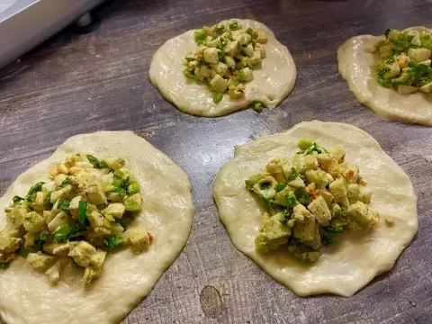 Обычно для начинки используется свежий зеленый лук, но в отсутствие такового не стоит отчаиваться. Обычный репчатый лук, мелко нарезанный и обжаренный на смеси растительного и сливочного масла до мягкости, привнесет в блюдо невероятный аромат. Также стоит упомянуть, что даже зеленый лук, обжаренный буквально на микроскопической порции сливочного масла в течение нескольких минут, раскроет свои вкусовые качества на новом уровне.