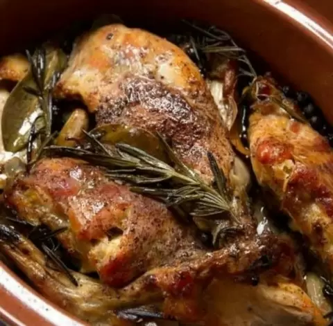 Обжарить ножки кролика на смеси масла до румяной корочки, после чего вынуть их из посуды. Лук нарезать кольцами и обжарить, добавив измельченный чеснок и белое вино. Дать вину немного выпариться, затем вернуть кролика в сковороду, добавить травы и специи. Накрыть крышкой и тушить 50-60 минут.