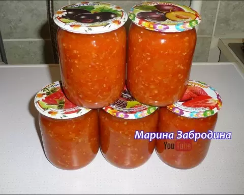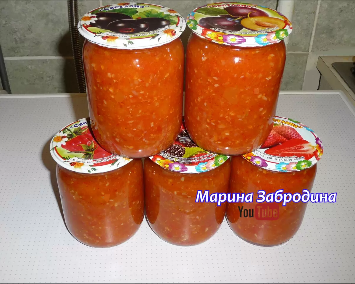 Готовый салат разливается по стерильным банкам, плотно закрывается крышками и ставится вверх дном на несколько минут для создания герметичности.