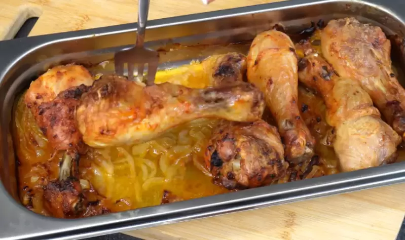 Для блюда подойдет как духовой шкаф, так и пароконвектомат. При желаемой температуре 160 градусов куриные ножки запекать нужно примерно 30 минут. Пока готовится курица, можно заняться капустным гарниром: нашинковав ее, добавить к ней натертую морковь, лук и заправить растительным маслом, посолив по вкусу.