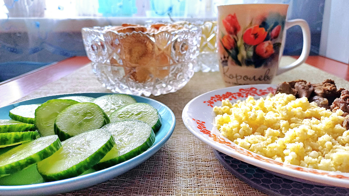 Для разнообразия, Ирина также добавила в обед свежий огурец, который придаёт блюду хрустящую текстуру и свежесть. Завершает эту кулинарную симфонию десерт – затяжное печенье в форме зверюшек и свежезаваренный чай с лимоном. Такой подход позволил создать гармоничное сочетание для перекуса и завершить диетический обед на приятной ноте.