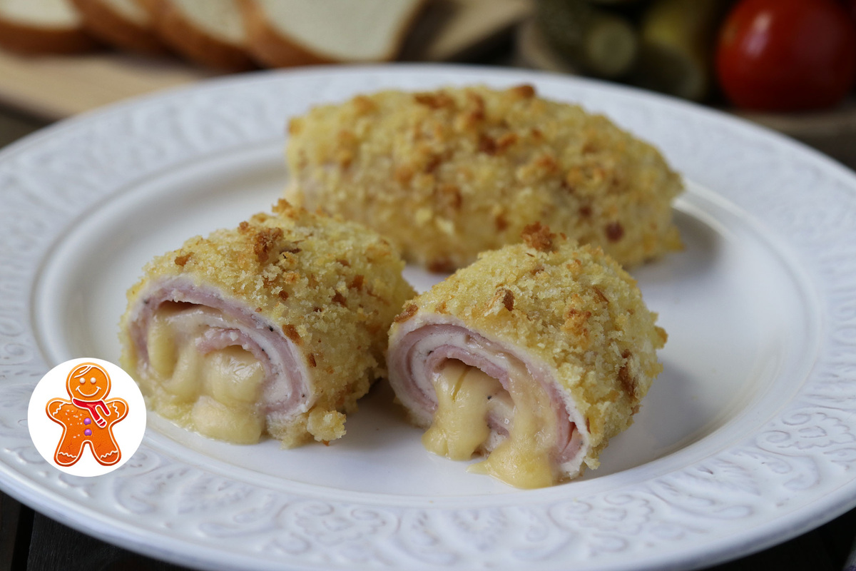 На каждый кусочек куриного филе помещается 1-2 ломтика ветчины и ломтик сыра. Затем рулеты аккуратно заворачиваются в пленку, создавая тугие формочки. Чтобы сделать панировку более хрустящей, на сковороде плавится сливочное масло, с которым производятся хлебные крошки.