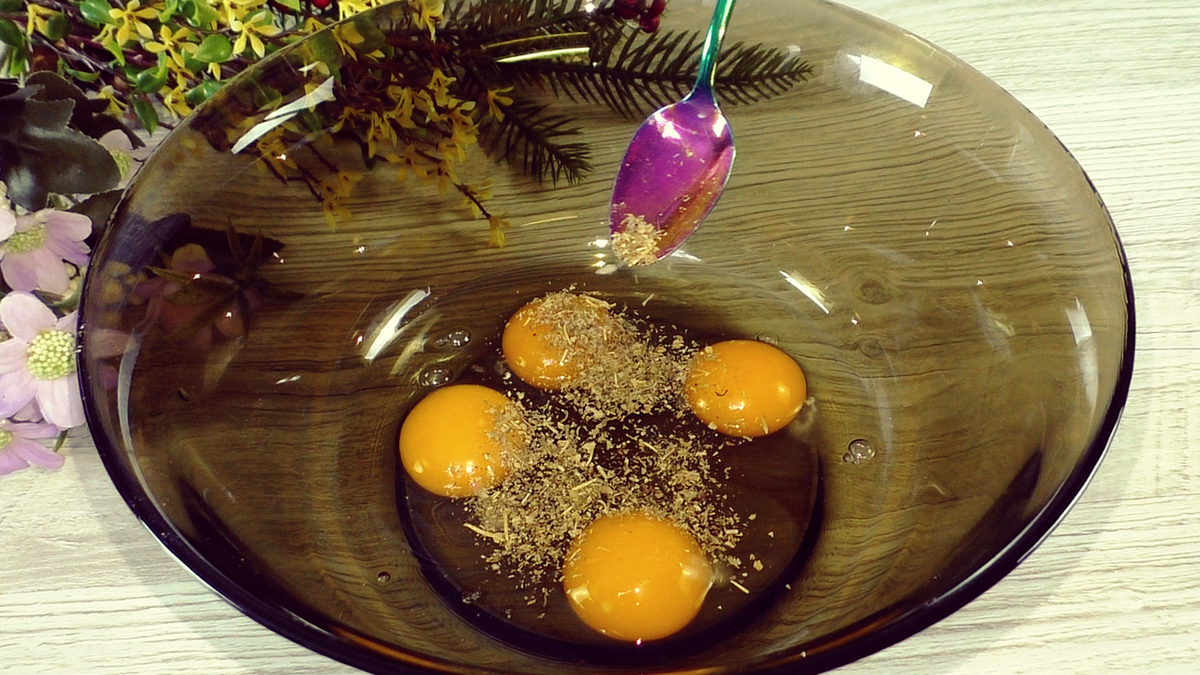 Первым делом яйца взбиваются в глубокой миске. Для стандартной сковороды диаметром 26 см это количество ингредиентов оптимально; если сковорода меньше, то пропорции можно уменьшить или же приготовить две лепёшки.
